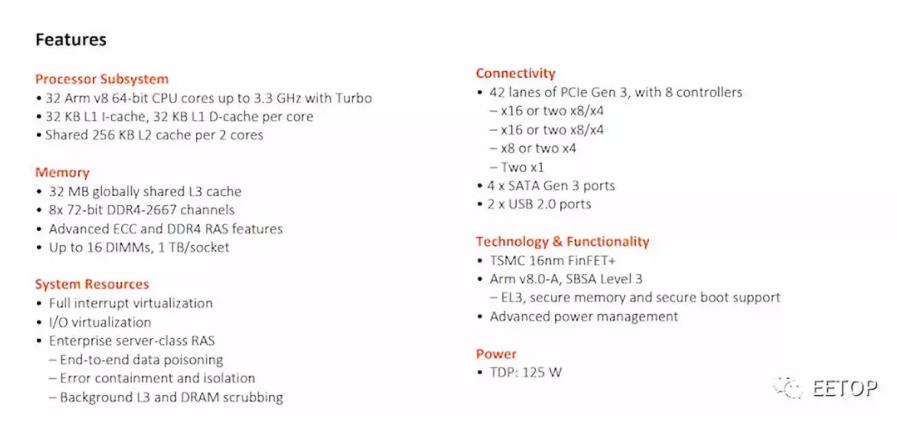 Ampere由前英特尔总裁RenéeJames创立,由凯雷集团资助,自2018年10月开始提供eMAG系列处理器。该公司于2018年初购买了AppliedMicro的基于X-Gene ARM的服务器资产,并提供定制的基于ARM v8.0架构的32核芯片,采用TSMC 台积电16FF +工艺构建,运行频率为3.3 GHz。该芯片基于X-Gene II平台并进行了优化,该公司计划在未来几年制定eMAG产品线的更新路线图。
