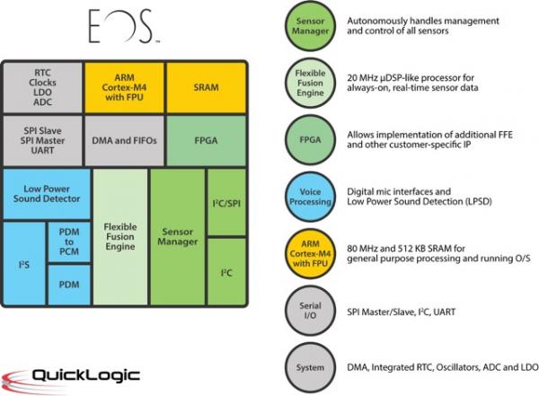 EOS平台是一种多核系统芯片(SoC),其中整合了三个专用处理引擎。这些处理引擎包括QuickLogic公司的类似于μDSP的灵活的融合引擎FFE,一个ARM公司的Cortex M4F微控制器(MCU)和前端传感器管理器。FFE引擎与μDSP相似,是QuickLogic的技术,已经申请专利。FFE引擎和传感器管理器负责大量的算法处理,从而充份地减少了浮点MCU的占空比。这种方法大大降低了总的耗电,因而移动设备、可穿戴设备和物联网(IoT)设备的设计人员能够设计出下一代使用传感器的应用系统,例如行人位置推算(PDR)、室内导航、运动补偿心动速率监测,以及其他先进的生物应用系统,同时保持功耗在要求的范围之内。