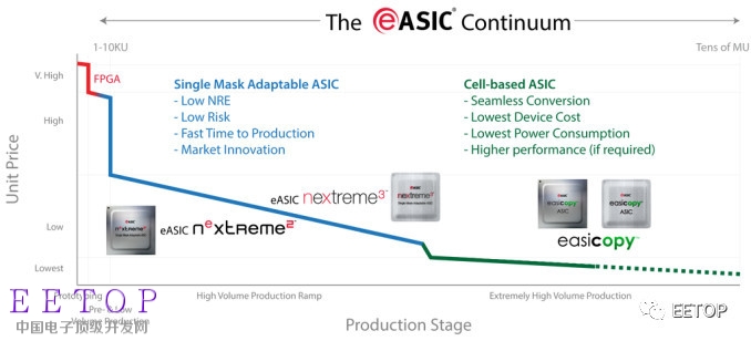 eASIC的商业模式介于传统Fabless芯片设计公司和芯片设计服务公司之间。其芯片可以说是重新启用了经典的sea-of-gates架构,即芯片上的逻辑单元以及相应的掩模都已经固定,而用户可以通过自行定义逻辑单元之间的互联(即金属掩膜层)来实现自己设计的逻辑,每次流片相当于一次metal change,因此成本和制造时间相对于传统ASIC都大大减少,当然其灵活性和性能也会打一些折扣。