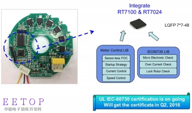 RT7100/RT7075即将通过IEC60730-1 B类家电安全标准日用品规范并符合认证通过UL。工程师可以直接利用这个UL认证缩短产品开发周期。RT7075内含Gate driver,可有效缩短马达控制电路板空间与成本。