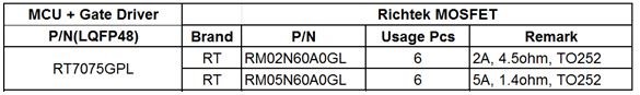 1. 二合一方案:RT7075内含Gate driver+ Richtek MOSFET