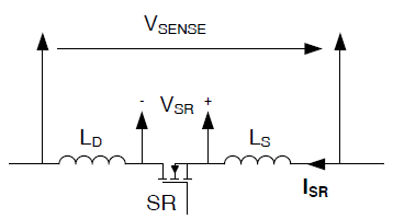 它包括RDSon压降(VSR)和由di/dt引起的封装电感(LD,LS)上的偏移电压。对于高di/dt和封装电感,该偏移电压可能很大并且同步整流器经常过早关断,这导致较长的体二极管导通时间和较大的传导损耗。