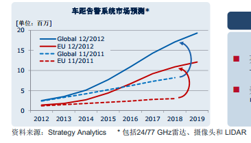 为了达到紧急制动的功能,需要一个远程的车距警告,根据第三方的数据,市场对这方面的功能还是非常乐观的。据Strategy Analytics对2011年及2012年的预测,对远程车距警告的需求每年都有一个非常快的增长(图3)。从2011年到2012年,他们也对数据做了很大的调整,把最终的量调高了很多。