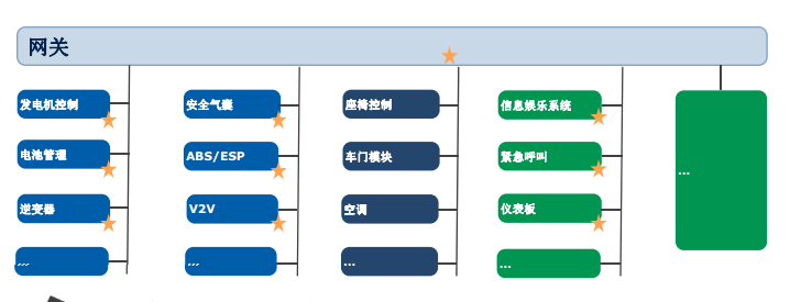 简单来说,还是从汽车最基本的架构开始分析。从发动机的控制系统到安全气囊的一些安全的功能,到车上的舒适性功能,包括最终的车内驾驶员信息处理的功能都需要安全性的保障。带星星的部分是必须有一些安防的功能加以保护的。例如,大家在动作片里看到了我在开车,我想往左拐,但是有通过远程控制把我的方向盘往右转了,车就会撞到一堵墙上了,这种功能都是将来车变成开放系统可能会遭到黑客袭击的一些方面。