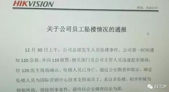 海康威视通报显示,跳楼事情发生后,公司拨打了120急救电话,并向110报警,相关部分及公司主管人员迅速到场。经120医生现场确认,坠楼人员已身亡。