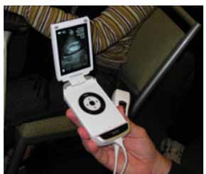 在Web 2.0峰会上,GE的CEO Jeff Immelt发布了一个低成本的便携超声扫描仪,名叫VScan。“这家伙大概也就黑莓手机那么大”Immelt拿着一个很像翻盖手机的玩意儿说。上半部分显示的是一个病人的肺部超声影像,下边是操作按钮。