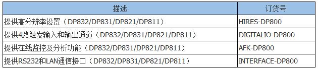 DP831,DP821,DP811和DP831A,DP821A,DP811A的主要区别在于编程分辨率、显示分辨率和回读分辨率的不同。另外,DP831,DP821,DP811的用户图形接口要单一一些,没有标配RS232和LAN接口,不过后续完全可以通过购买选件升级获得这些非标配的内容。下表是具体的选件名称及对应的功能说明: