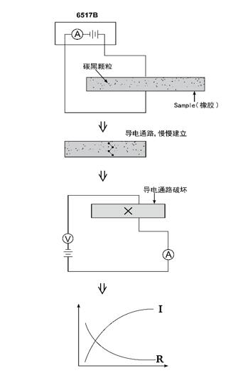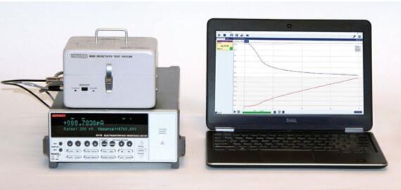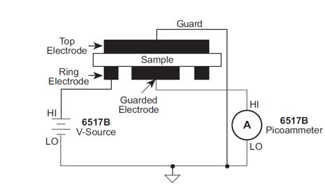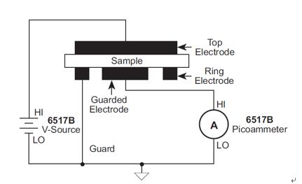 样品的小电流I,随后体积电阻率 用公式 计算得出。其中, =体积电阻率, =电极接触的有效面积, =样品厚度,R=V/I(施加的V-Source和