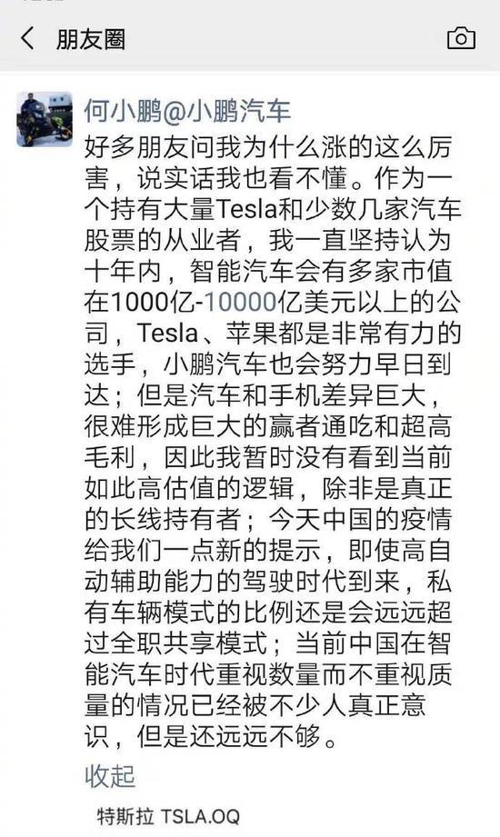 北京时间2月5日凌晨消息,小鹏汽车的创始人何小鹏朋友圈发文评价特斯拉股票大涨,他认,十年内,智能汽车会有多家市值在1000亿-10000亿美元