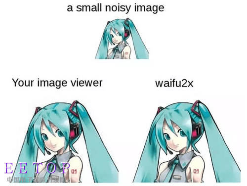 图2 waifu 2x超分辨率重建对比,上方为低分辨率且有噪声的动画图像,左下为直接放大的结果,右下为waifu 2x去噪和超分辨率结果