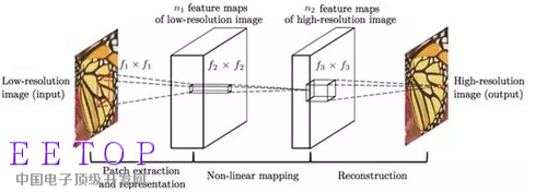 图3 超分辨率重建算法流程。从左至右依次为:低分辨率图像(输入)、经过若干卷积和池化操作得到的低分辨率特征图、低分辨率特征图经过非线性映射得到的高分辨率特征图、高分辨率重建图像(输出)