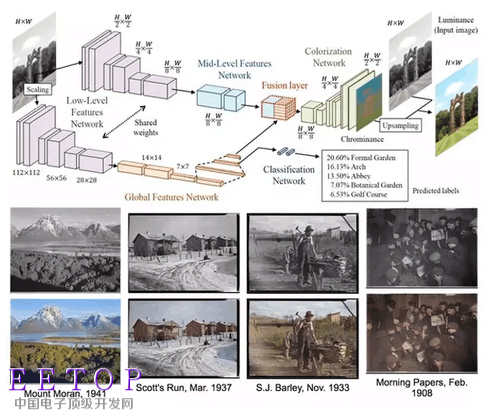 图4 图像着色的深度学习网络结构和效果。输入黑白图像后即分为两支,上侧一支用于图像着色,下侧一支用于图像分类。在图中红色部分(Fusion layer),两支的深度特征信息进行融合,由于包含了分类网络特征,因此可以起到“用分类结果为依据辅助图像着色”的效果