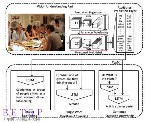 图5 Image Caption网络结构。图像作为输入,首先经过微调后的多标记(Multi-Label)分类网络得到预测的类别标签,并以此连同图像的深度特征作为下方语言模型LSTM的输入,最终进行联合训练。下图左一可完成Image Caption任务,左2为单个单词图像问答任务,右1为句子级别的图像问答任务