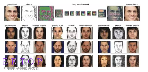 就在六月初,荷兰科学家在arXiv上发布了他们的最新研究成果——通过深度网络对人脸轮廓图进行“复原”。如图6所示,在模型训练阶段,首先对真实的人脸图像利用传统的线下边缘化方法获得对应人脸的轮廓图,并以原图和轮廓图组成的“图像对”作为深度网络的输入,进行类似超分辨率重建的模型训练。在预测阶段,输入为人脸轮廓(左二Sketch),经过卷积神经网络的层层抽象和后续的“还原”操作,可以逐步把相片般的人脸图像复原出来(右一),与最左边的人脸真实图像对比,足够以假乱真。在模型流程图下还另外展示了一些人像复原的结果,左侧一列为真实人像,中间列为画家手工描绘的人脸轮廓图,并以此作为网络输入进行人像复原,最终得到右侧一列的复原结果——目测以后刑侦警察再也不用苦练美术了。