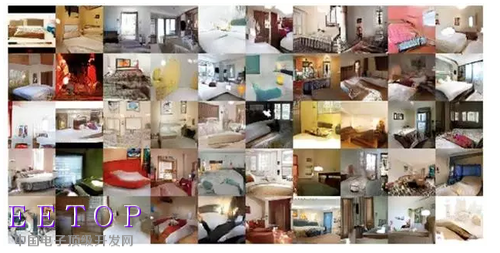接下来,GAN中的零和博弈就发生在“判别式网络”和“生成式网络”上:“生成式网络”想方设法的让自己生成的图像逼近真实图像,从而可以“骗过”“判别式网络”;而“判别式网络”也时刻提高警惕,防止“生成式网络”蒙混过关……你来我往,如此迭代下去,颇有点“左右互搏”的意味。GAN整个过程的最终目标是习得一个可以逼近真实数据分布的“生成式网络”,从而掌握整体真实数据的分布情况,因此取名“生成对抗网络”。需要强调的是,GAN不再像传统的监督式深度学习那样需要海量带有类别标记的图像,它不需任何图像标记即可训练,也就是进行无监督条件下的深度学习。2016年初,在GAN的基础上,Indico Research和Facebook AI实验室将GAN用深度卷积神经网络进行实现(称作DCGAN,Deep Convolutional GAN),工作发表在国际表示学习重要会议ICLR 2016上,并在无监督深度学习模型中取得了当时最好的效果。图8展示了一些由DCGAN生成的卧室图像。