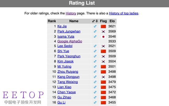 从去年10月到现在,AlphaGo接连战胜了欧洲棋手樊麾和韩国棋手李世石,总战况目前为8胜1负。按照GoRatings.org的算法,如果一名选手从未遭受失利,就不会进入排名统计。