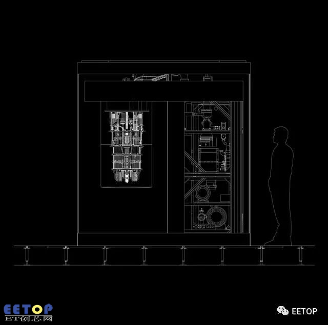 根据IBM官网上透露的照片,这个集成的量子计算系统颇具设计感。硼酸玻璃板的厚度为半英寸(约1.3厘米),前后两扇门可自动开启,方便工程人员在停机时间快速检修藏在后面板背后的制冷和控制模块。不过,如果前后门同时开启,整个玻璃方盒就成了不稳定的平行四边形,因此需要一些独立的钢铝框架进行固定。整个结构力求使振动最小化,减少可能存在的干扰。