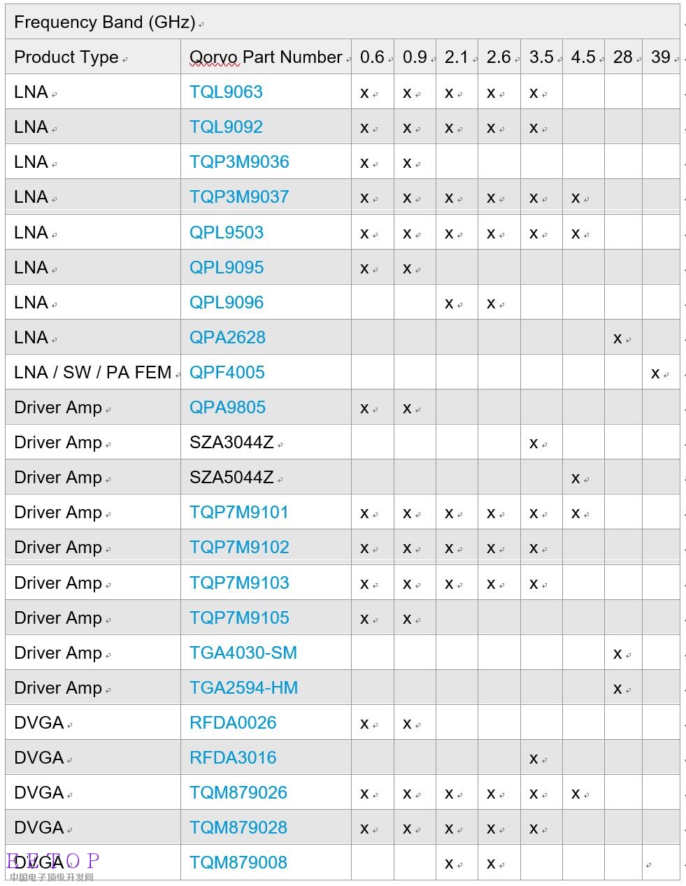随着5G移动用户人数今后几年将会加速增长,至2022年预计将达到8900万。市场对于5G通信频段产品的需求量也将逐步攀升,Qorvo产品的工作频率范围很宽,可以提供引脚兼容的产品系列,客户无需重新设计PCB或系统布局,从而能够节省成本。下表包含Qorvo部分面向无线基础设施的产品以及各个产品支持的频段。