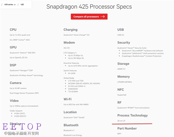 需要注意的是,骁龙425采用的是依然是28nm工艺制造,和骁龙410一样,这也是目前中芯国际能够量产的最高等级的芯片了。