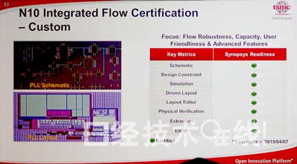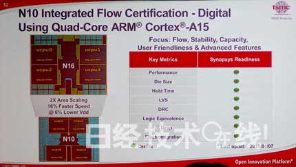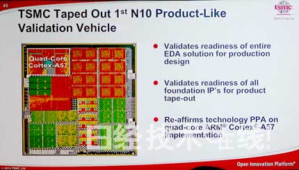 Chen表示,10nm工艺的设计流程也已准备就绪,可供客户使用(图8)。台积电在数字设计方面,使用四核的“ARM Cortex-A15”进行了验证(图9)。在定制和模拟设计方面,使用PLL完成了验证(图10)。而且,接近成品的第一款验证芯片已经送厂生产。这款验证芯片集成了四核的Cortex-A57等(图11)。(记者:小岛郁太郎)