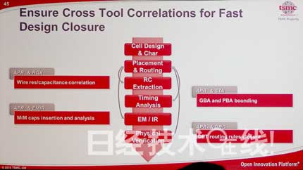 Chen重新指出,随着工艺向16nm、10nm的微细化,自动布局布线与其他工序的联动将变得愈发重要(图3)。比如说,在自动布局布线和寄生RC提取中,布线电阻与电容的相关性,在自动布局布线与EM(electronic migration)/IR压降分析中,MiM(metal insulator metal)电容的插入与分析等。