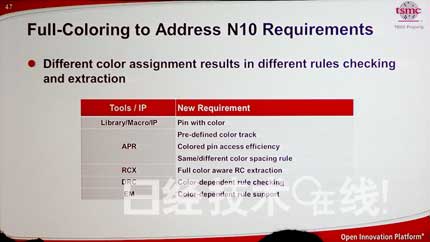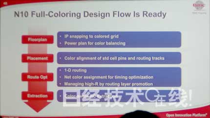 对于20nm之后的16nm工艺,适应FinFET是主要课题。而10nm工艺将采用三重曝光(通过分3次进行曝光,形成在28nm工艺之前,经1次曝光在Si上形成的图案)。台积电把设计三重曝光时,划分第1次曝光数据、第2次曝光数据和第3次曝光数据叫作“全分色”(Full-Coloring)。另外,虽然这次没有发布,但根据推测,之后的7nm工艺估计将会采用四重曝光。