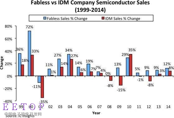 Insights的统计数据显示,上一次全球IDM厂业绩成长表现超越无晶圆厂IC业者,是在2010年,两大阵营各自成长35%与29%,那一年晶片产