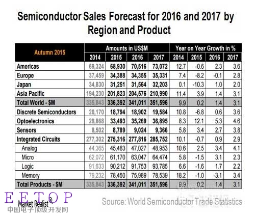 半导体市场将呈现回暖趋势,2016年和2017年将分别增长1.4%和3.1%。
