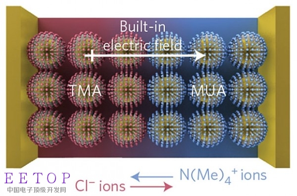 “配体四周包围着自由运动的抗衡离子。关键在于要使这些移动中的抗衡离子能够在电场中得到应用,并以此建立离子梯度,最终使得电子流经纳米粒子。”——Unist Bartosz Grzybowski