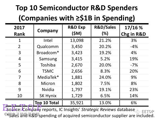 2017年全球18家半导体企业研发投入超10亿美元,无中国大陆企业