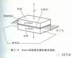 1962年美国霍尔用p-n同质结制成了第一个半导体激光器。产生激光必须满足3个条件:粒子数的反转分布、谐振腔和电流超过一定阈值。