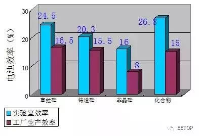 不同的半导体材料在实验室和产业中制成的太阳电池效率