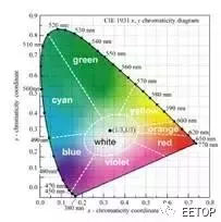 众所周知,由红(Red)、绿(Green)、蓝(Blue)三基色可合成白光,如图24所示。该图为1931色度图,三角形中央虚线区为白光区。氮化镓LED一般只能发出一种颜色的光。白光照明也要通过RGB三基色的合成来实现。RGB三基色可以直接靠LED发射三基色光,也可用LED去激发荧光物质,通过二次光转换获得三基色光或准三基色光。