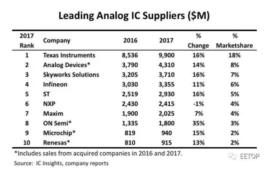 重磅!2018全球十大模拟IC厂商排名出炉!TI模拟部分突破百亿蝉联第一,ST增长26% 进步最大!