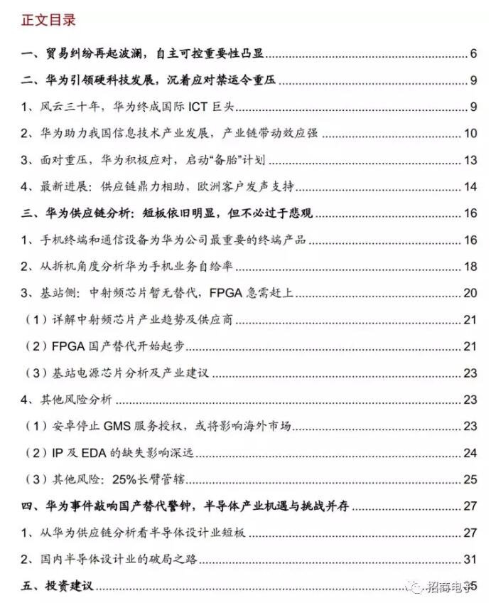 2、华为引领硬科技发展,沉着应对禁运令重压:华为历经三十余年耕耘拼搏,构建了运营商业务,企业业务,消费者业务三大板块。2018年公司营收7212亿人民币,研发投入率达14.1%,全球专利申请数第一。或许正是感受到了华为引领的中国科技力量的威胁,5月16日美国商务部将华为列入“实体名单”内,实施禁运。面对断供威胁,华为一方面提前预备了半年到一年的库存,同时通过自研及导入国内供应商的方式,打造了“备胎”计划。同时公司还得到了全球其他国家供应链及下游客户的支持。