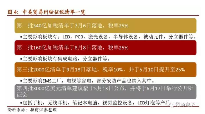 从征税角度看,前期2000亿美元税单进一步提升税率,但由于该板块主要涉及家电业务及部分安防产品,所以对电子产业影响不大;而新增的3000亿美元包括手机、笔记本电脑、耳机等消费电子相关产品,或将促使消费电子对美出口的成品业务产能对外转移;而零组件业务不直接受关税影响,此前不少优质公司早有海外布局,中美贸易摩擦将进一步加速优质公司的全球化工厂布局,产能协调及管控能力望一步提升,推动行业发展。