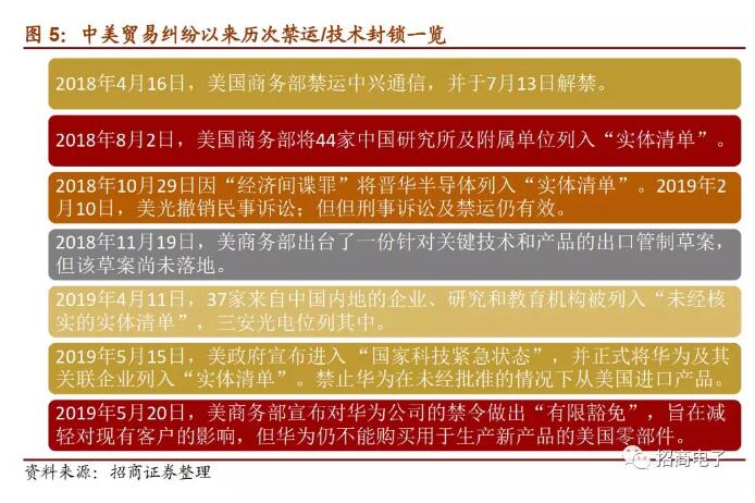 1、贸易纠纷再起波澜,自主可控重要性凸显:中美贸易纠纷是宏观环境的重要影响因子。自5月5日以来,美方态度发生急转,无端提升税率、对华为实施禁运等一系列举措均为已渐趋和解的中美关系蒙上了一层阴影,贸易纠纷波澜再起。从征税角度看,前期2000亿美元税单对电子产业影响不大。新增的3000亿美元或将促使消费电子对美出口的成品组装业务产能对外转移。相较征税,技术禁运的影响更为深远,在中美贸易纠纷的大背景下,半导体自主可控的迫切性凸显。
