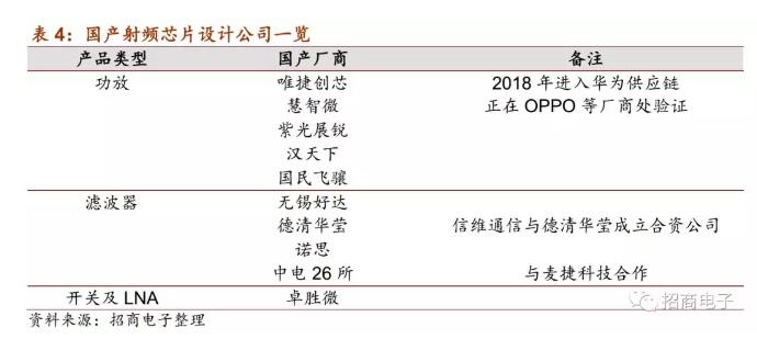 目前国产射频PA厂商主要有唯捷创芯(2018年打入华为供应链),慧智微(正在OPPO等厂商处验证),中科汉天下,国民飞骧等。而射频开关及LNA厂商主要有卓胜微。