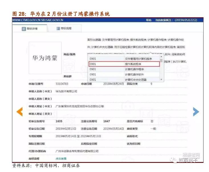 面对软件封锁,任总前期在接受采访时表示正在与谷歌公司协商救济方案。同时,华为也在积极开发操作系统,目前已注册鸿蒙商标。据余承东透露,该系统将横跨手机,平板及电脑,并兼容安卓APP。预计早在2019Q3,迟在2020Q1就将推出。