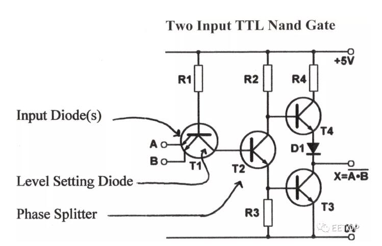 该示意图看起来有点奇怪,但它没有问题)为什么那更好?当输入变低时,晶体管导通并从相分离器的基极上拉出电荷。这缩短了关闭分相器所需的时间,速度是试图加快电路响应的工程师面临的头号问题。与大多数发明一样,人们并不总是完全清楚谁应该获得荣誉。TTL门的真正工作IC版本比上面的简化描述要多得多。在Sylvania工作的Tom Longo是第一个将它们整合到商业上成功的IC中的人。TTL门的工作IC版本比上面的简化描述要多得多。在Sylvania工作的Tom Longo是第一个将它们整合到商业上成功的IC中的人。