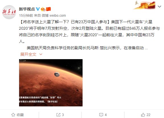 据新华视点消息,目前已有超过846万人报名参与将自己的名字刻到硅芯片上,跟随“火星2020”一起前往火星,其中中国有23万人。