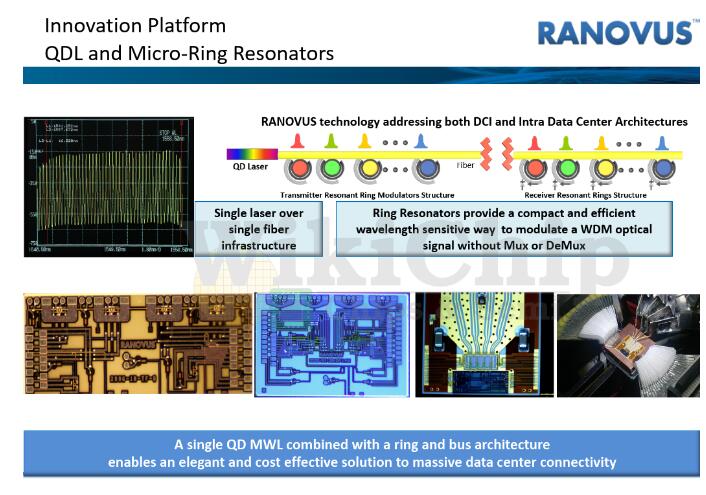 Ranovus公司一直在研究几种关键技术,使其光学产品得以实现。其中一项技术是基于量子点(梳子)激光器。QDL是一种特殊的激光器,能够从一个芯片上同时产生多个波长的激光器。量子点并不是一种新技术,但现有的实现依赖于相对较低的数据速率--大约每秒几千兆比特的数据速率。要实现高带宽,需要大量的并行通道。Ranovus表示,他们不仅能够设计出具有大量波长的激光器,而且能够实现非常高的数据速率。我们说的是100Gbps甚至更高,这比我们最近看到的其他一些技术演示要高数倍。关于他们的技术,需要注意的关键是,这不是一个实验室的演示。Ranovus公司的第一款基于该技术的产品是37波长激光器。该公司早在2012年就已经演示了该技术。