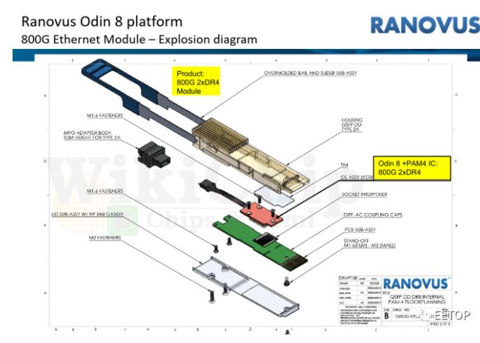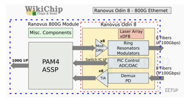 Odin 8芯片是一个相当通用的芯片,它可以用于许多不同的应用。事实上,Ranovus公司本身就在使用Odin 8来开发800G以太网模块。他们已经与两家公司合作开发PAM4芯片,PAM4芯片将与Odin 8封装在一起,形成一个完整的模块。Odin 8芯片已准备就绪。。缺少的是在100G下运行的PAM4,目前尚不存在。他们正在与多家供应商合作,准备制作完整的模块。预计明年一季度开始市场部署。