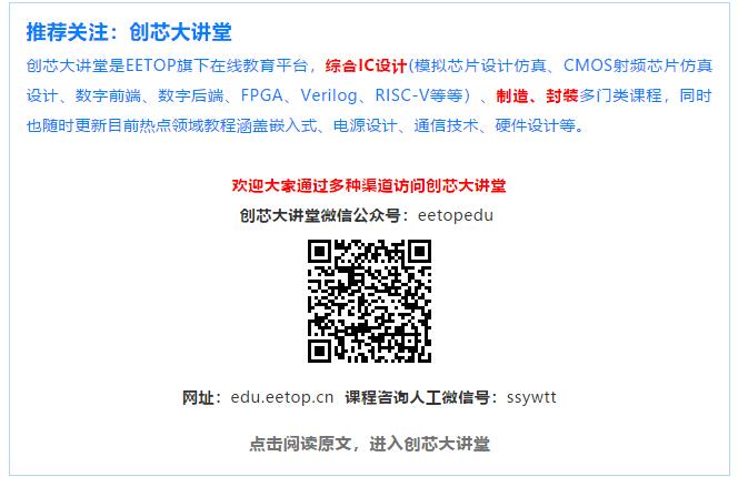 创芯大讲堂是EETOP旗下在线教育平台,综合IC设计(模拟芯片设计仿真、CMOS射频芯片仿真设计、数字前端、数字后端、FPGA、Verilog、RISC-V等等)、制造、封装多门类课程,同时也随时更新目前热点领域教程涵盖嵌入式、电源设计、通信技术、硬件设计等。