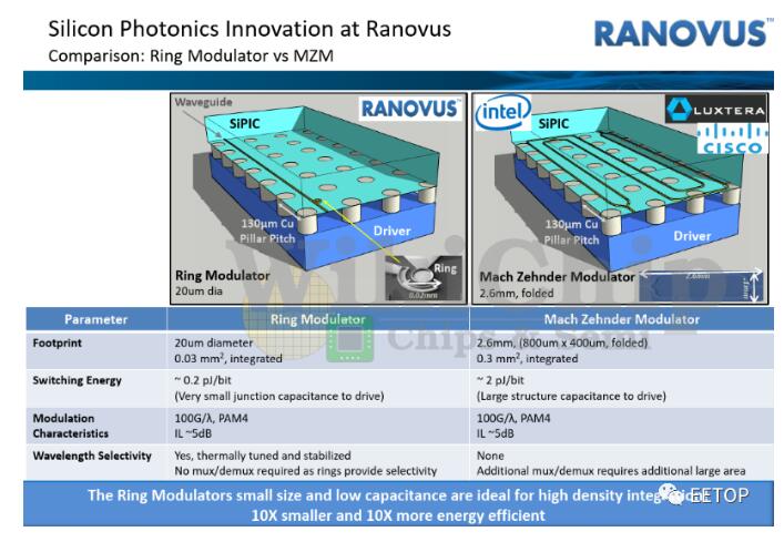 作为Ranovus产品组合的一个单独的关键技术是环形共振器的使用。我们之前已经谈到过环形谐振器。它们实际上是一种波长滤波器,可以让它们在波导的单一波长上工作。目前市场上的许多现有技术都使用MZM,如英特尔和Luxtera公司生产的MZM(虽然环形谐振器是由其合作伙伴Ayar Labs公司使用的)。
