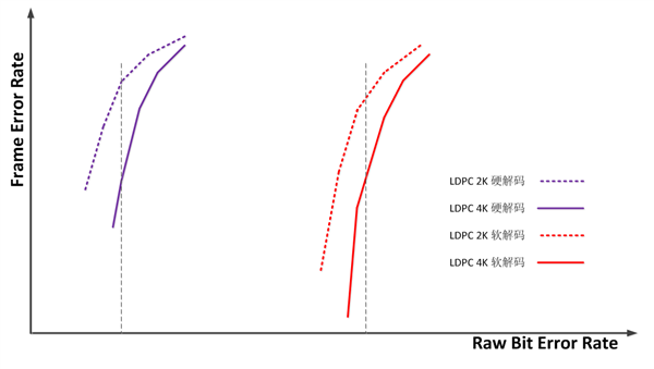 或者说在相同纠错失败概率(UFER)要求下,4K LDPC能容忍更高的闪存颗粒原始误码率(RBER),从而可以大大延长闪存的使用寿命。