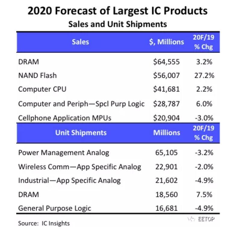 IC Insights预测,到2020年,DRAM将占据3683亿美元的整体IC市场的17.5%。DRAM市场在2018年达到994亿美元的历史最高销售额,DRAM销售额占整个IC市场的23.6%。预计NAND闪存将成为2020年第二大IC市场,销售额达560亿美元,增长27%,将是是今年所有33种IC产品类别中最强劲的增长率。像DRAM一样,NAND销售额创历史新高也是在2018年,当时市场规模达到594亿美元。预计今年NAND闪存市场将占IC总市场的15.2%。预计与DRAM一起,这两种存储器类别将占今年所有IC销售额的近三分之一。尽管2020年总体微处理器增长不如今年年初预期的强劲,但在全球新冠疫情危机期间,互联网使用量的增加使大型计算机CPU市场类别受益。最初,由于中国和亚洲的供应链限制和其他问题,计算机销售下降,但是随着病毒流行期间更多的消费者,学校和企业增加对互联网的使用,对个人计算系统和数据中心服务器的需求在20季度第二季度有所增长。因此,对计算机CPU MPU的预测显示,销售额将增长2.2%,达到约417亿美元。 疫情危机大流行在今年上半年严重冲击了手机市场,但预计下半年智能手机的销售将逐步改善,尤其是随着5G手机的的逐渐普及。到2020年,手机应用处理器的销售额预计将下降3.0%,至209亿美元,这仍将使其成为第五大IC产品类别。 预计2020年IC单元出货量的五个最大类别中的三个将是模拟器件。到2020年,电源管理模拟器件的出货量预计将再次超过下三个最大的IC产品类别的总出货量。预计列表中显示的三个模拟类别中的每一个今年的单位出货量都将下降。 DRAM成为2020年单位IC出货量最大的类别之一。由于Covid-19爆发,随着计算机出货量的增加以支持在线业务,教育和电子商务活动的增长,预计DRAM单位将增长7.5%。达到近186亿个单位。