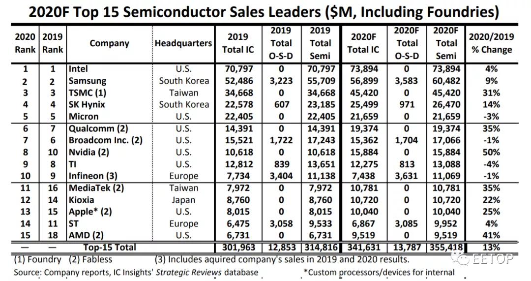 2020-11-24 11:41:09 EETOP昨天IC Insights发布了2020年全球前15家半导体供应商的预测排名(见图一)。