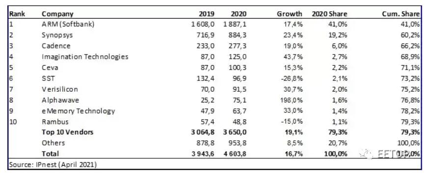 2021-04-21 13:35:44 EETOPARM再次稳居第一,市场份额超过40%,同比增长17.4%。分别来看ARM的IP专利费销售增长16%,IP许可证销售增长19.9%。