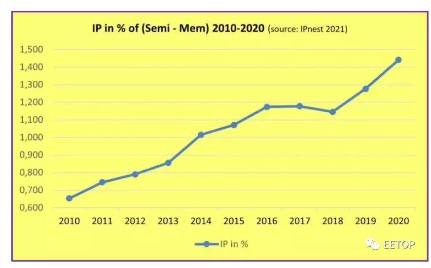 另一个值得强调的有趣点是IP业务与半导体业务(较少内存业务、DRAM和Flash)的比例。当半导体业务从3020亿美元增长到3220亿美元,即增长6.8%时,IP增长了16.7%,几乎比半导体市场高出10%。
